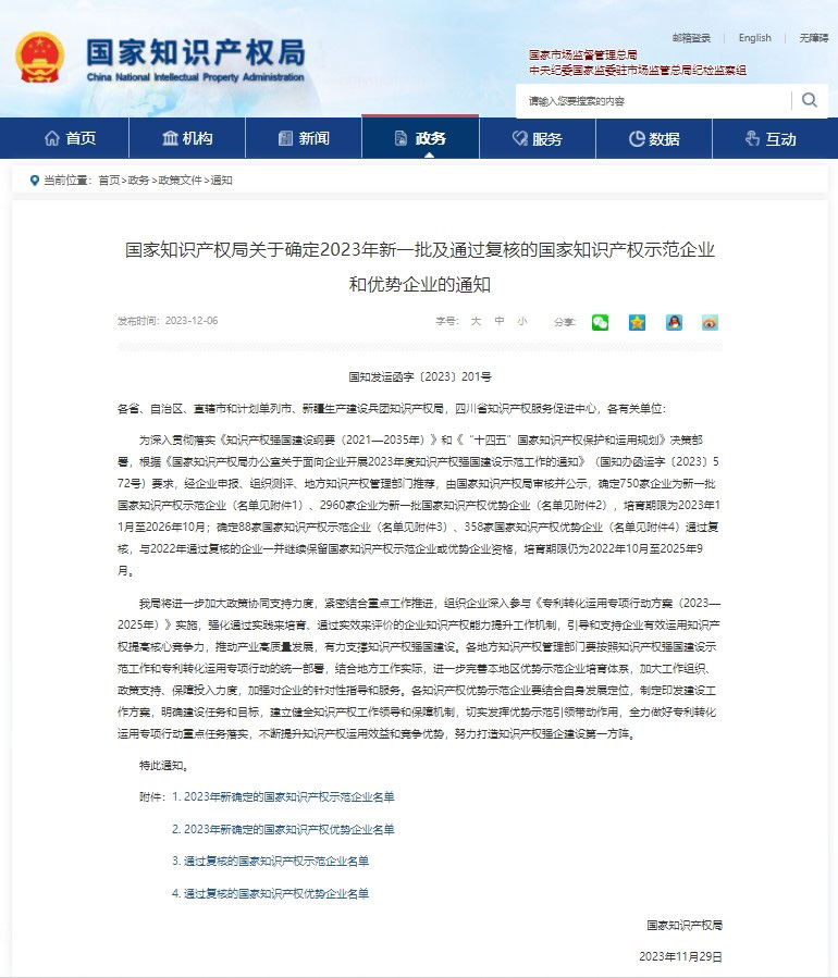 近日,知识产权局发布了《知识产权局关于确定2023年新一批及通过复核的知识产权示范企业和优势企业的通知》,圣阳股份获评“知识产权优势企业”,这是自圣阳股份荣膺“企业技术中心”、“CNAS实验室”、“博士后科研工作站”及“绿色工厂”等荣誉后又一张“企业名片”。